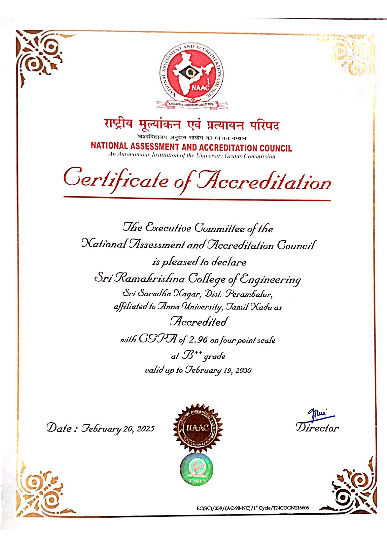 The executive committee of the National Assessment and Accreditation Council is pleased to declare Sri Ramakrishna College of Engineering – Perambalur as Accredited with B++ grade.