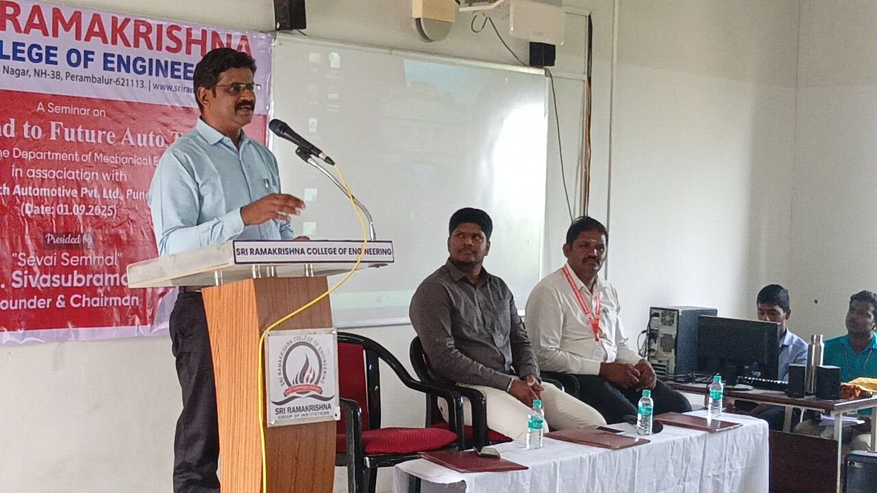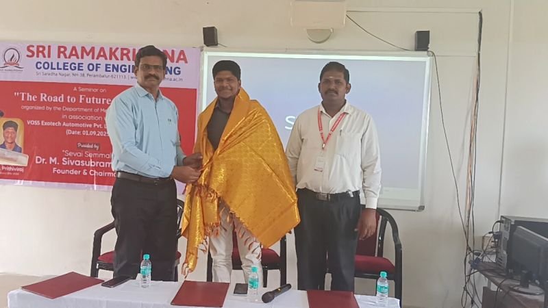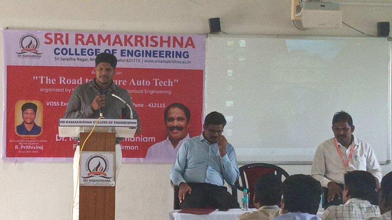 The Department of Mechanical Engineering of Sri Ramakrishna College of Engineering organized a seminar titled "The Road to Future Auto Tech" on 01.09.2025 in association with VOSS Exotech Automotive Pvt. Ltd., Pune. The event was presided over by "Sevai Semmal" Dr. M. Sivasubramaniam, Founder & Chairman of the institution. Engineer R. Prithiviraj,PRITHIVIRAJ R Business Development Officer and an esteemed alumni student (Batch 2016–2020), served as the resource person and shared valuable insights on the advancements and future trends in the automotive industry. The seminar provided participants with knowledge about innovative technologies and emerging developments in the field of automobile engineering.