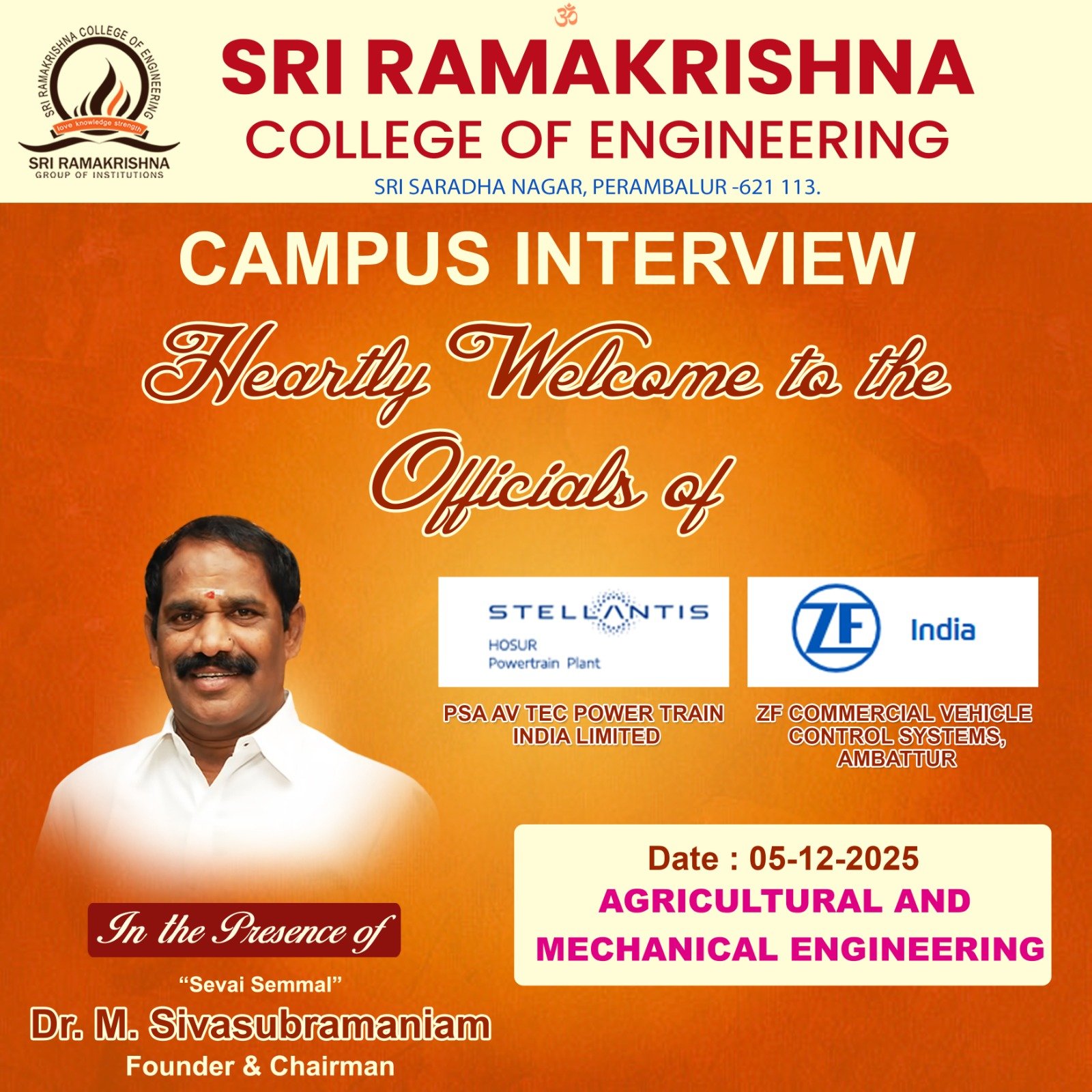 Sri Ramakrishna College of Engineering, Perambalur, is organizing a Campus Interview Drive on 05 December 2025 for the students of Agricultural Engineering and Mechanical Engineering.