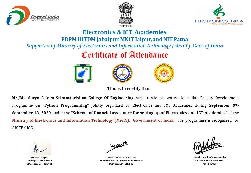 In Sri Ramakrishna College of Engineering, many faculties have undergone various UGC-recognized Open and Distance Learning (ODL) programs such NPTEL, SWAYAM, IGNOU, ATAL to acquire flexible, high-quality education for learners across India.